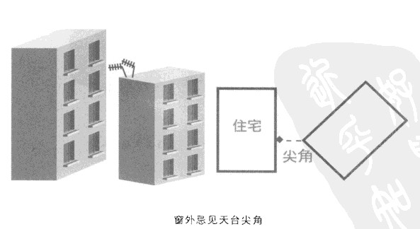 住宅的窗外忌正對另一妝大廈的天臺尖角,如果住宅樓層對外的景觀正是對著尖角位,住在宅內的人所受的損害當然最大,而對于愈底層的住戶,這種尖角的風水影響便愈小——例如對面那形成尖角煞氣的大廈有二十層樓高,而自己所居住的層數是在十八九樓或以下,根本看不見該大廈的尖角,因此你的家宅便不受煞氣便最為嚴重,必須加以化解;至于住在二十二樓以上,影響則又會逐步遞減。